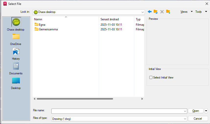 - Chaos Desktops genvägar till projekt går att nå direkt från din applikations "Öppna"- eller "Spara som"-dialog som till exempel i AutoCAD.