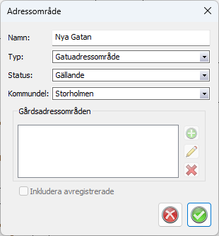 Under ikonen för Skapa nytt adressområde fyller du i information om det nya adressområdet, namn, vilken typ av adressområde det är, vad adressområdet har för status samt i vilken kommundel den ligger.
