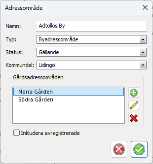 Under ikonen för Redigera adressområde har du möjlighet att redigera ett befintligt adressområde. Om du har skapat ett byadressområde har du möjlighet att lägga till gårdar. Detta gör du under Gårdsadressområden. Här kan du även redigera och ta bort gårdsadressområden.