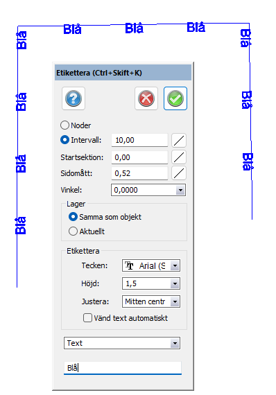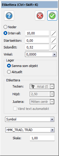 - Väggeometri - välj linje och markera om längd, radie, sektion, parameter och/eller bäring ska skrivas ut bredvid linjen.
