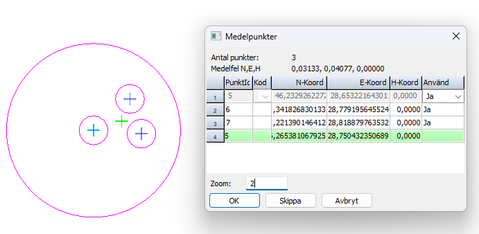 När kommandot körs så visas en dialog med resultaten från medelpunktsberäkningen. Man kan välja om man ska använda eller inte använda valda punkter för medelpunktsberäkningen. Klickar du OK så beräknas medelpunkten. Klickar du Skippa så går du vidare till nästa punktsvärm.