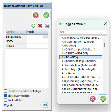 Funktion för att tillämpa attribut på objekt. Välj attribut och välj objekt du ska tillämpa attributen på.