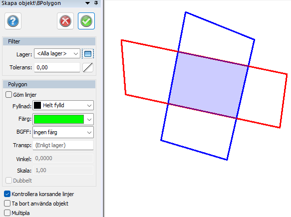 Ställ in eventuell tolerans. Det är möjligt att filtrera på lager om man vill att polygon endast ska skapas med objekt i ett visst lager.
