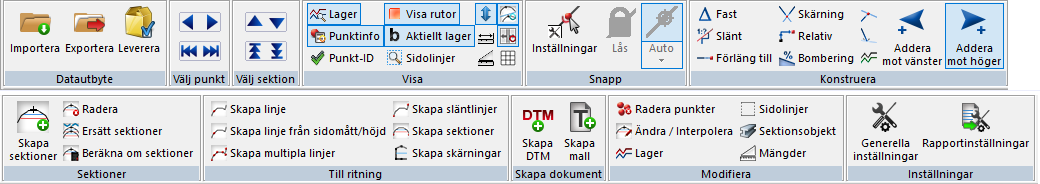 Export av beräknade sektioner, främst för maskinguidning. MBS, LMD, LandXML, Topcons format kan exporteras. |