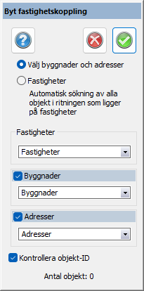 Välj detta alternativ för att automatiskt söka ut alla byggnader och/eller adresser i ritningen du vill uppdatera fastighetskoppling för.