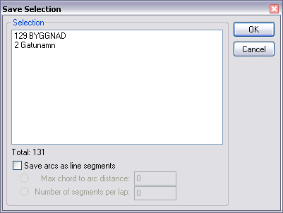 Dialogen visar vilka lager som berörs, hur många objekt som är markerade i varje lager samt det totala antalet objekt som kommer att sparas.