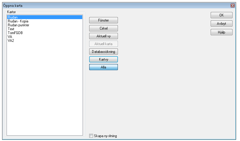 Funktionen öppnar karta från vald databas. Det går att göra en sökning i samband med detta. Sökning kan göras från ett eller flera objekt i databasen och med en buffrad zon runt dessa objekt. Man kan även ange att öppna hela kartan, aktuell vy (lika med det fönster som nu är öppet) eller med hjälp av fönster som antingen kan markeras i ritningen eller anges med koordinater. När kartan öppnas markeras de objekt man sökt på.