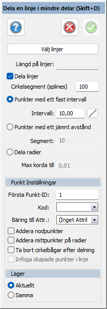 Lägger till brytpunkter i en linje. För att kunna välja detta val behöver du bocka ur Dela linjer, och sedan välja antingen Punkter med fast intevall eller Punkter med ett jämnt avstånd.