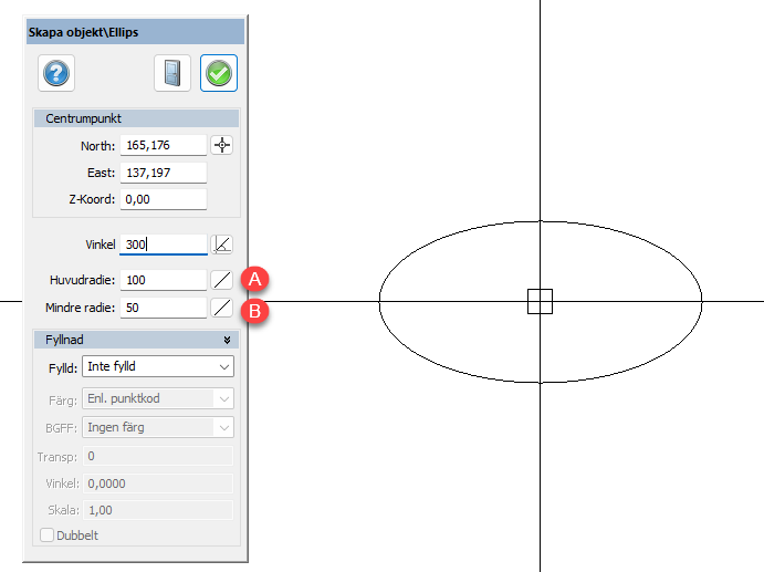 Funktion för att skapa ellipser. Ellipsen består av en insättningspunkt, en vinkel på huvudradien (A), en huvudradie och en mindre radie/lillradie (B).