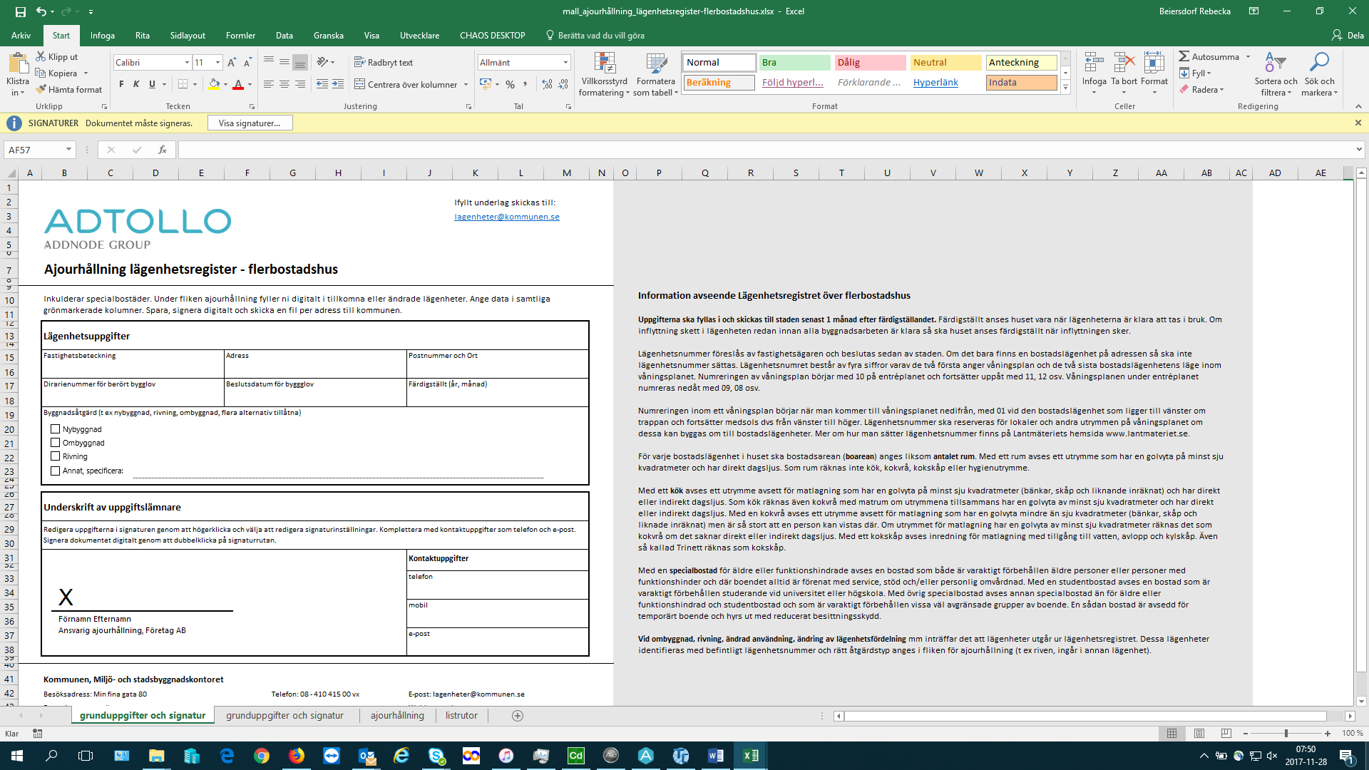 Texten anpassas med egna kommunens logga, kontaktuppgifter och rutiner. Filen distribueras till fastighetsägarna som rapporterar in lägenheterna digitalt. Filen signeras digitalt av fastighetsägarens representant.
