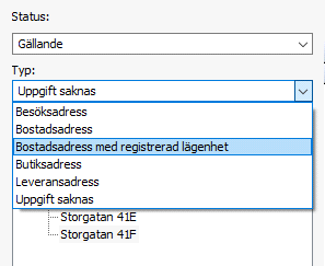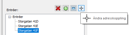 Om en entré är kopplad till en felaktig adressplatspunkt, men däremot är lägenheterna kopplade till entrén korrekta, då åtgärdas detta med Ändra adresskoppling.
