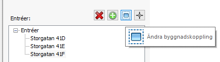 Om en entré skulle vara kopplad till fel byggnad, åtgärda då detta genom att använda Ändra byggnadskoppling:
