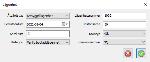 I fönstret Entré, sätt typen för entrén till Bostad med registrerad lägenhet så kommer en småhuslägenhet att genereras automatiskt på bostaden. En småhuslägenhet visas i lägenhetsgriddet och har endast den boarea som sattes på byggnaden. Inga andra attribut behöver anges för en småhuslägenhet. Om så önskas kan boarean därefter ändras i fönstret Entré, liksom att nya lägenheter kan läggas till.