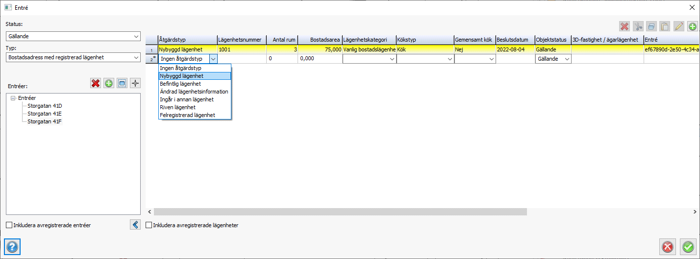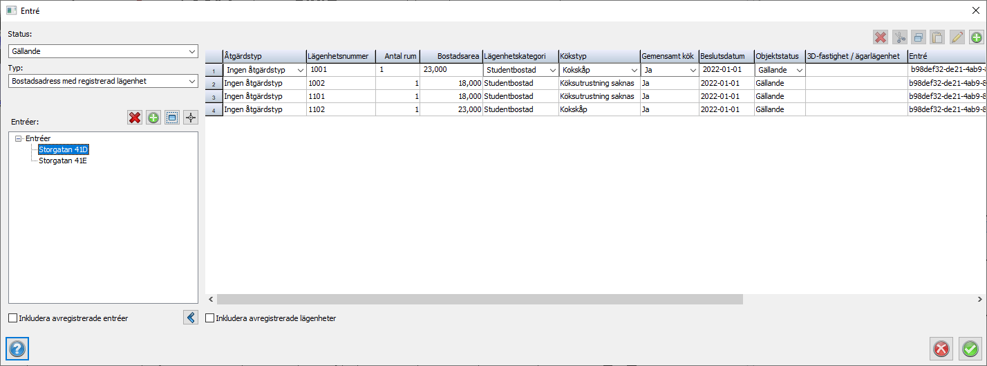 - I fönstret Entré visas de entréer (kopplingar) som finns till olika adressplatspunkt/er samt lägenheter. Med kryssrutorna längst ned i fönstret Entré ges möjlighet att även Inkludera avregistrerade entréer samt Inkludera avregistrerade lägenheter i listan över entréer respektive lägenheter.