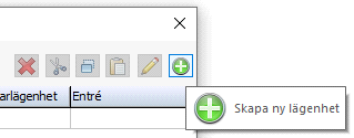 - En ny lägenhet kan också läggas till med Skapa ny lägenhet. Fönstret Lägenhet öppnas, fyll i information. Tryck på OK och ny lägenhet visas i lägenhetsgriddet.