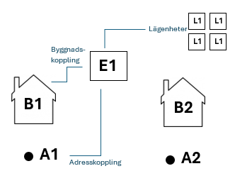 Tillvägagångssätt för att se aktuella kopplingar mellan BAL-objekt, skapa en ny entré som binder ihop en byggnad med en adressplatspunkt samt ett par lägenheter:
