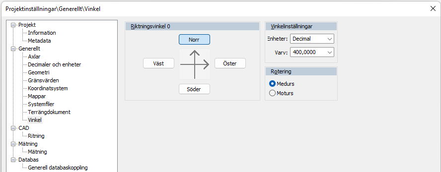 Ange om det ska vara decimalt (400 GON per varv), streck (6.28 per varv) eller Grader (360 grader per varv).