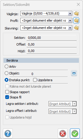 Kommandot beräkna sektion/sidomått beräknar detta från koordinater i förhållande till en väglinje. Den kan beräkna antingen från punkter i en fil, från objekt i ritningen eller från enstaka koordinater direkt i dialogen.