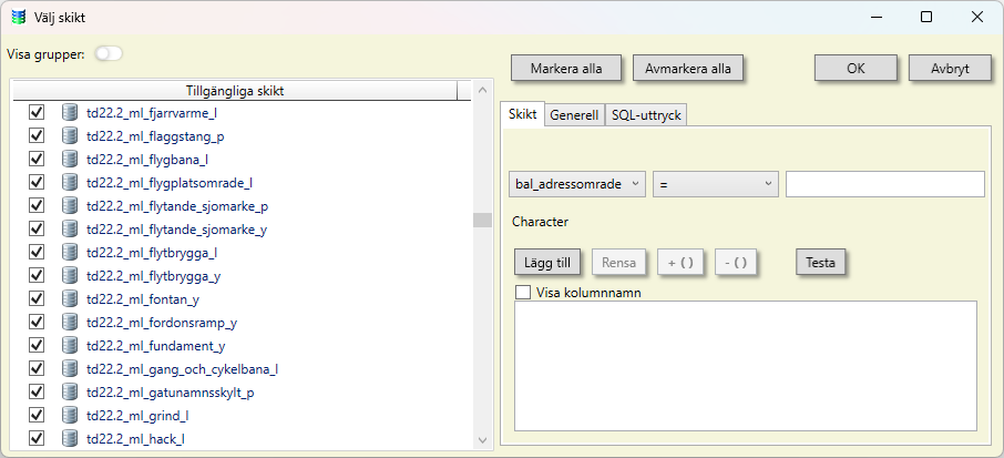 Kan användas för att öppna ett eller flera lager till en karta du redan öppnat. När du klickar på Öppna lager får man upp Lägg till skikt-rutan. Här väljer man en karta som man vill lägga till skikt/lager ifrån.