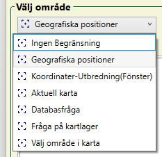 F. Under Välj område kan du göra ett antal olika val i rullistan för hur du vill öppna ett område i kartan.