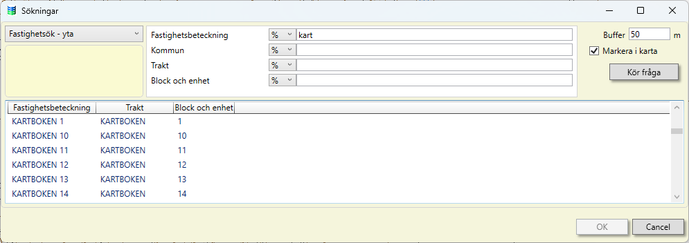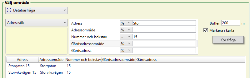 • Databasfråga - Här har du möjligthet att skriva in en specifik sökning, exempelvis kan du söka på en adress eller en fastighet. Välj vad du vill söka på i rullistan som visas. Det finns möjlighet att anpassa sökningen. När du skrivit in sökningen och klickar på Kör fråga ser du resultatet i rutan under. Välj resultat och klicka OK för att öppna en karta över ditt sökningsresultat. Det är möjligt att ställa in en buffer för hur stort område som ska öppnas. Du kan även bocka i Markera i karta, då kommer sökningen att markeras. Det går att välja antingen ett resultat eller flera.
