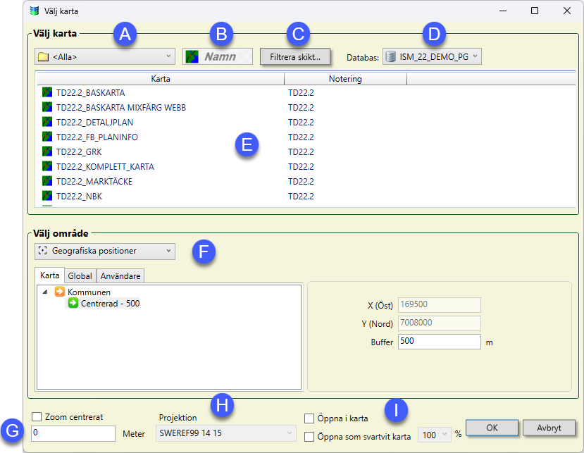 H. Här visas den projektion som finns inställd för kartan i ISM Admin.