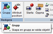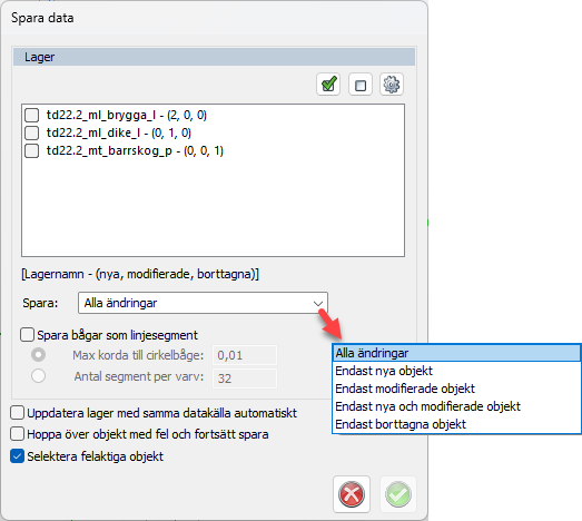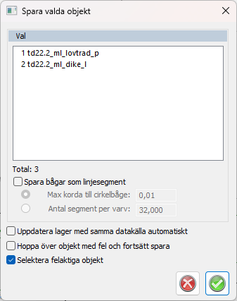 Kommando för att spara valda objekt. I listan visas antal objekt markerade i respektive lager.