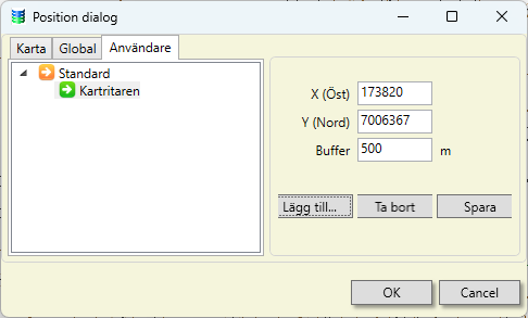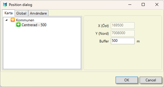 • Geografiska positioner - Här kan du välja förinställda geografiska positioner som finns angivna nedan under flikarna Karta, Global eller Användare. Ställa in geografiska positioner sker i ISM Admin.