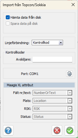 Om du inte kopplar direkt mot com-port bockar du i Hämta data från disk. Du kan då välja bland sdr, cdr och mxl. Det formatet vi rekommenderar att använda är formatet .mxl (Magnet XML).