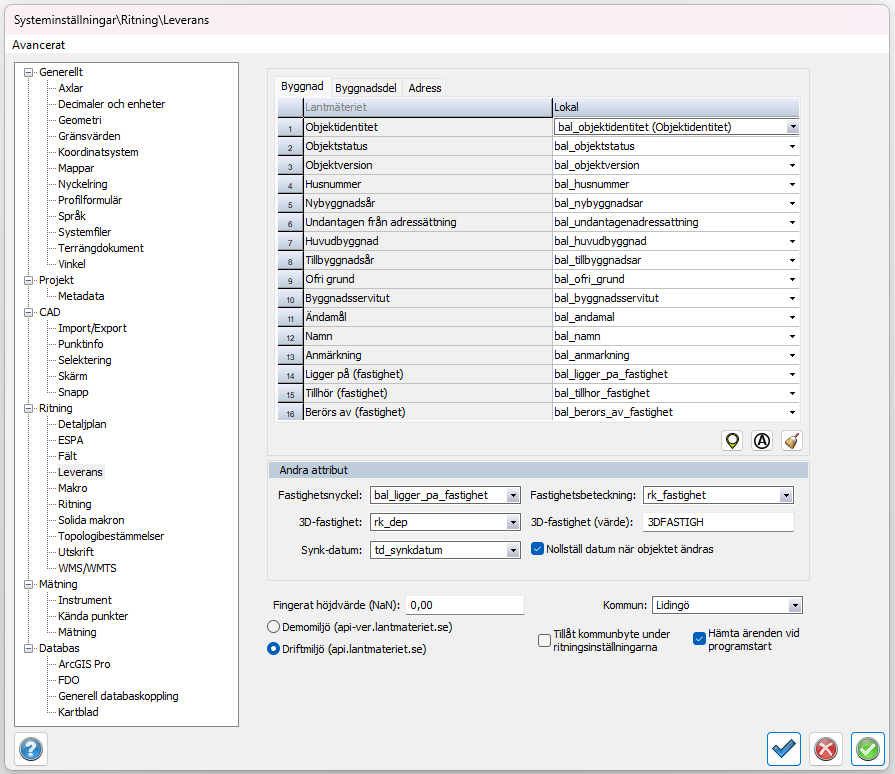 - Mappa attribut: Här mappar du din databas mot Lantmäteriets attribut samt anger inställningarna under Andra attribut.
