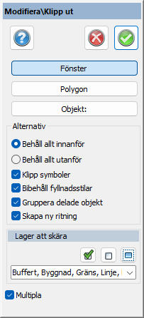 Välj mellan att klippa med hjälp av ett fönster du ritar ut själv, välj en polygon eller välj ett objekt. Beroende vad du har ibockat under Alternativ klipper funktionen bort allt utanför eller innanför.