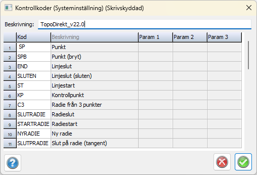 Kontrollkoden anges antingen under Systeminställningar eller under Projektinställningar, Systemfiler. Själva koden kan ändras så länge det inte blir dubbletter i listan. Inmatning av kontrollkoder sker i punktkodsfältet, efter punktkoden och anges med någon avskiljare, oftast bara ett mellanslag.