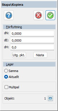 Ger dig möjlighet att kopiera flera gånger på samma kommando. Detta fungerar bara när du sätter in nästa punkt grafiskt, dvs med musen. Kopierar du objekt enbart med hjälp av dX eller dY-mått kan du inte använda multipla kopieringar.