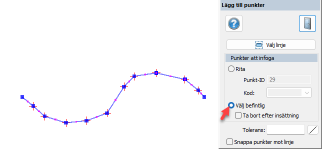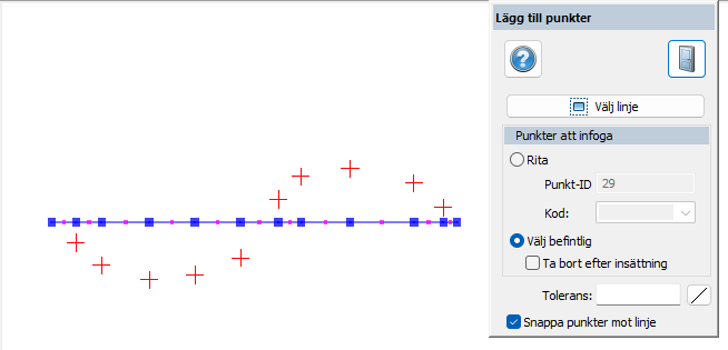 Väljer man att bocka i Snappa punkter mot linje skapas nya punkter längs med linjen i de markerade punkternas position.