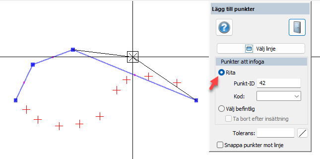 Bocka i Rita för att klicka ut punkter, eller bocka i Välj befintlig och markera befintliga punkter för att lägga till dessa i linjen.