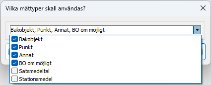 Resultatet hamnar i en ny mätdatafil (SUR). Val sker vilka mätningar som ska reduceras, samma typ av inställning som görs vid import av mätdata till nätutjämning. Välj vilka mättyper som ska ingå i medelvärdesbildningen.