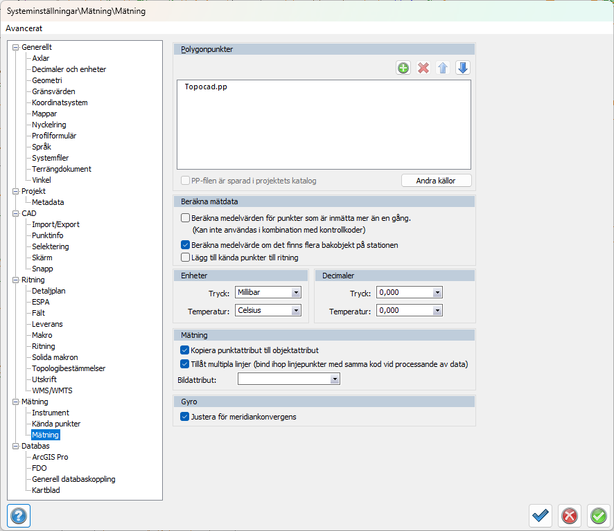 Under Mätning avgörs från vilken fil polygonpunkterna ska hämtas. Det är viktigt att de polygonpunkter som användes finns i denna fil. Observera att speciella regler finns för den som hämtar polygonpunkterna från en databas.