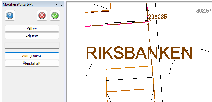 Kommandot justerar texter som är kapade av ritningsvyn och gör så att de "hoppar in" i vyn. Detta kan göras automatiskt eller manuellt. Automatiskt placerade texter kan justeras manuellt.
