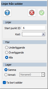 Kommandot skapar linjer av soliders ytterkanter, välj mellan att skapa alla underliggande, alla överliggande eller alla linjer/kanter på solider. Dessa linjer kan sedan användas för utsättning.