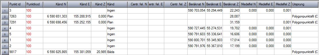 Efter genomförd beräkning ser vi Beräknat X, Y och Z, samt Medelfel X, Y och Z för punkterna, som talar om beräknat läge för nypunkterna, samt vilken precision de har. För närmare förklaring till dessa rubriker, se Rapport.