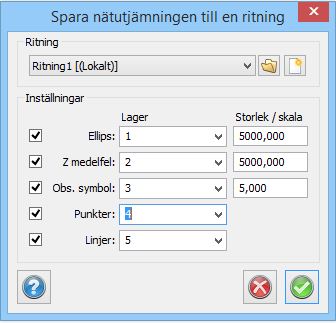 Genom att gå till kommandot Nätutjämning|Spara nätutjämning till ritning sparas alla detaljpunkter och även överbestämda punkter ner till valfri ritning. Du får här ange vilken ritning genom att ange en tidigare sparad, en öppnad eller en helt ny ritning.