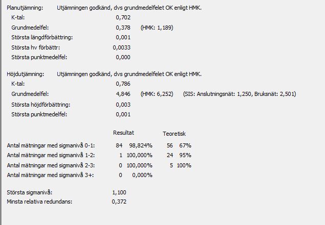 Vi får sedan reda på de viktigaste resultaten som gör att man kan bedöma om utjämningen ska godkännas eller ej för plan respektive höjd. Här ingår nätets grundmedelfel, k-tal, samt största punktmedelfel i plan (felellipsens storaxel) och höjd. Man får även mätningarnas största sigmanivå, förbättring (för vinkel, längd och höjdskillnad) och lägsta relativa redundans (individuellt k-tal). Se beskrivning av dessa parametrar i kapitlet Rapport.