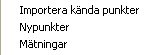 Kända punkter av formatet PP (Polygonpunkter) eller PXY kan importeras. Deras punktnummer tänds med automatik och inställningar för detta görs under Arkiv|Inställningar|Punktinfo.