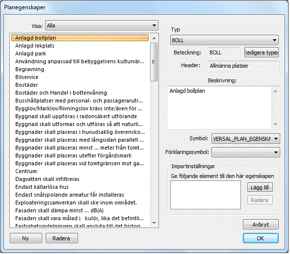 Här kan du lägga till, ta bort och redigera dina planbestämmelser som är definierade i din CVP-fil som du hänvisar till i systeminställningarna.