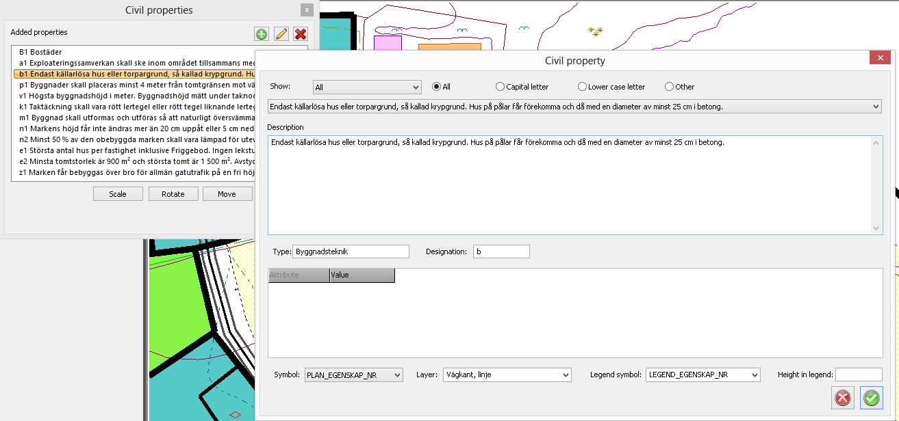 Till varje planegenskap kan du koppla Typ, Beteckning, Beskrivning, Symbol, Förklaringssymbol.