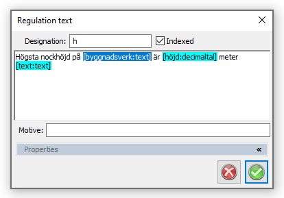 Vissa bestämmelser kräver komplement av text. I dessa fall kommer ett fönster upp där texten ska skrivas in. De blåmarkerade styckena är de som ska ersättas med användarens text. Använd TAB för att hoppa mellan dessa fält.