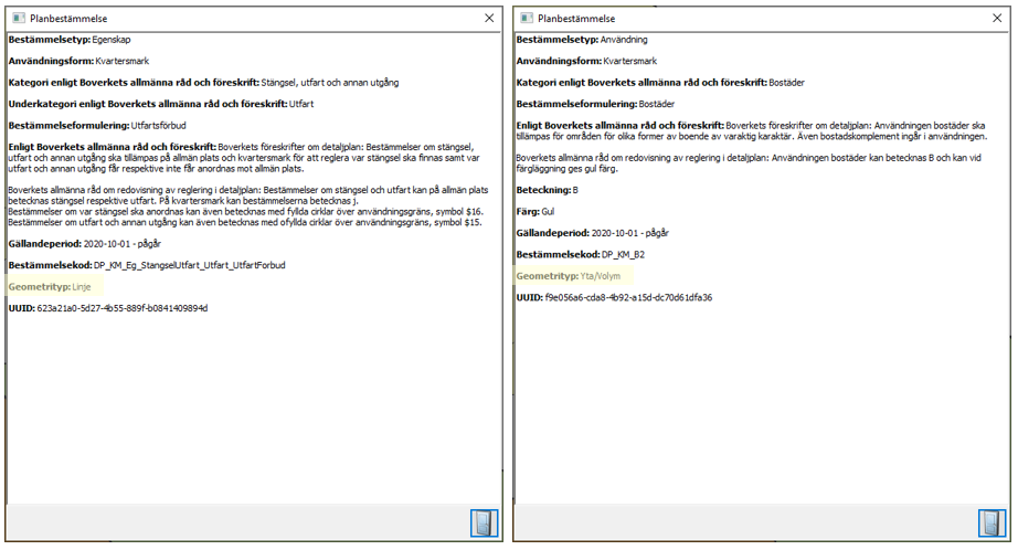 Genom att dubbelklicka på bestämmelsen får du upp hela dess text. Här framgår också på vilken typ av geometri bestämmelsen ska appliceras på, exempelvis på en yta eller linje.