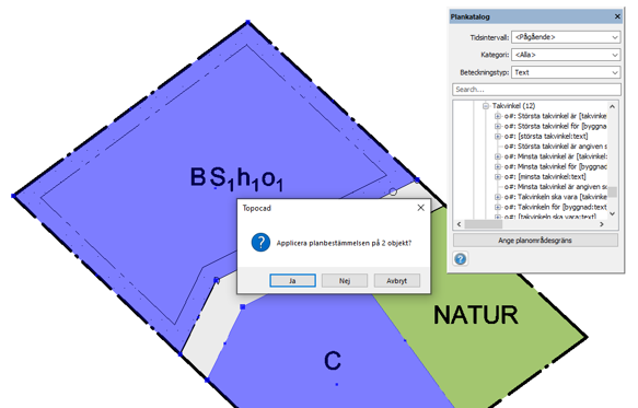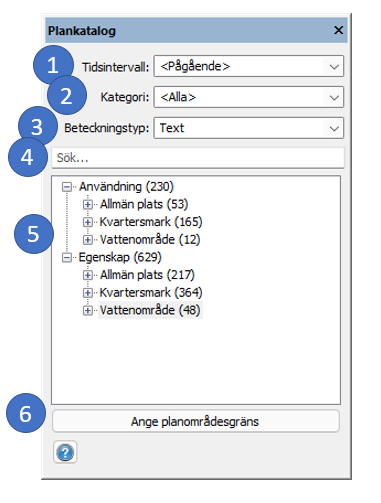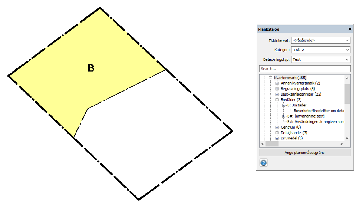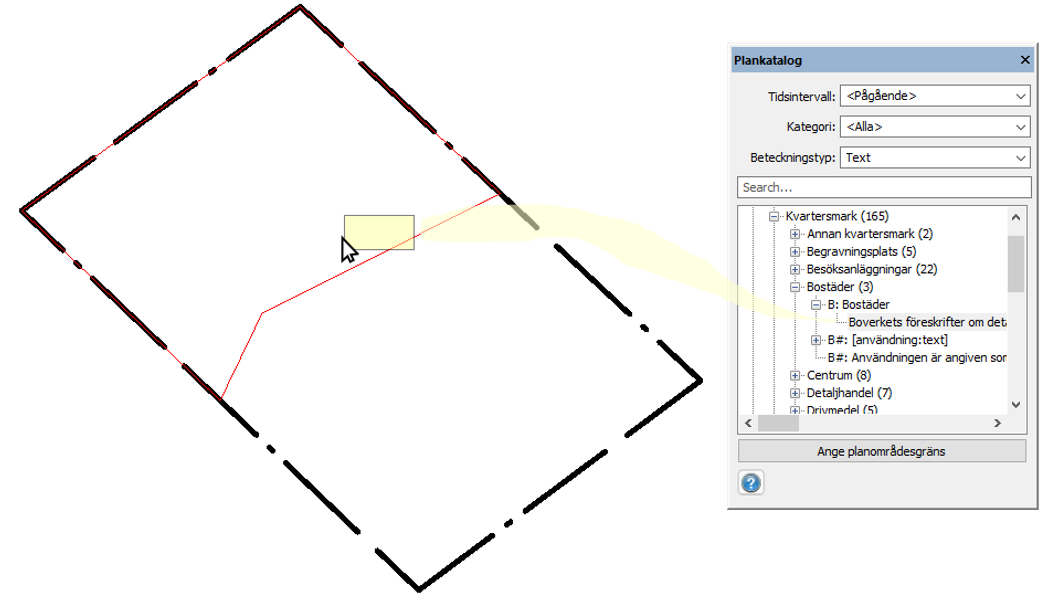 Första gången kommandot startas laddas plankatalogen från Boverket och sparas lokalt. Det kan ta några sekunder. Därefter kan användning och egenskaper sättas ut på ytorna i kartan genom att välja och sedan dra och släppa på ytorna. Färg och linjetyp sätts automatiskt enligt den hierarki som gäller. Själva verktygsfönstret kan förstoras genom att ta tag i kanterna och dra.