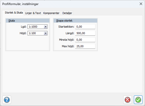 Vertikal skala samt horisontell skala. Förhållandet mellan höjd respektive sektion/längd avgörs här. Det är möjligt att ange vilka skalor som helst. Dessa skalor används även vid insättning av profilformuläret i ritningen. Standard skalor är: Vertikal 1:1000, Horisontell 1:200