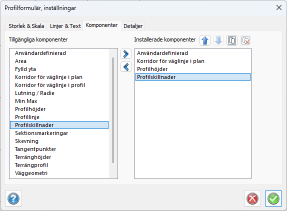 I dialogen finns två listor, den vänstra för tillgängliga komponenter och den högra för installerade komponenter. Listan påminner om de som används vid redigering/inställning av mätdata samt redigering/inställning av koordinatdata i textredigeringsdokumentet.